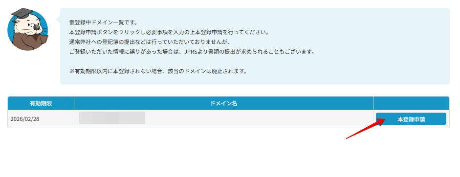 登録を行ったドメインは通常のドメインと同じようにご利用できますが、仮登録より6ヵ月以内に本登録申請が必要です。