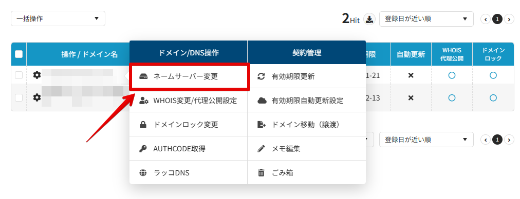 ラッコドメインの管理ドメイン一覧ページで、パーキングページを表示したいドメイン名をクリック→「ネームサーバー変更」を選択します。