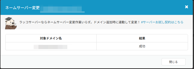 結果:成功と表示されたらネームサーバーの変更は完了です。