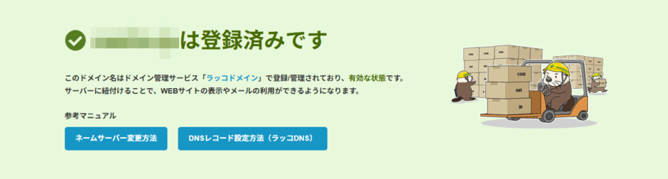 ラッコドメインでドメインを取得すると、パーキングページが自動的に表示されます。