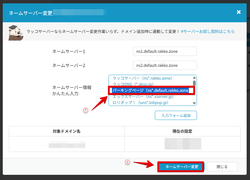 「ネームサーバー情報かんたん入力」から、「パーキングページ(ns*.default.rakko.zone)」を選択します。