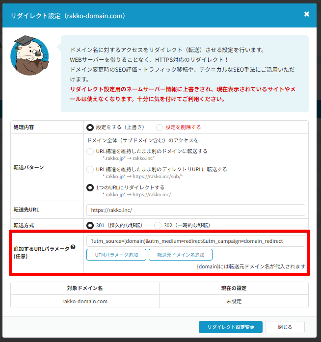 | 追加するURLパラメータ(任意) | ?utm_source={domain}&utm_medium=redirect&utm_campaign=domain_redirect |