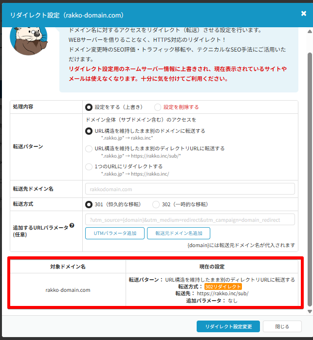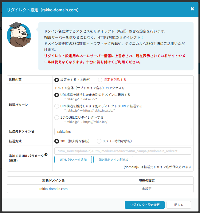 ラッコドメインで管理しているドメインに対するアクセスを、別のURL(または別ドメイン)へ恒久的に(301)もしくは一時的に(302)転送できる機能です。