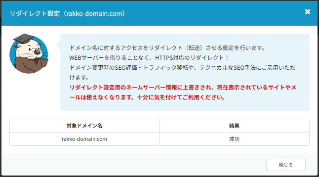 設定対象ドメインのネームサーバー情報は、リダイレクト設定用のネームサーバー情報(ns1.default.rakko.zone/ns2.default.rakko.zone)に上書きされます。